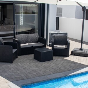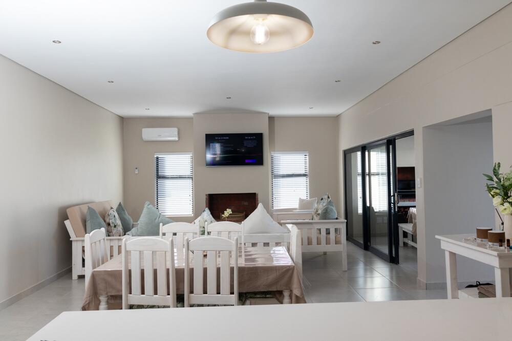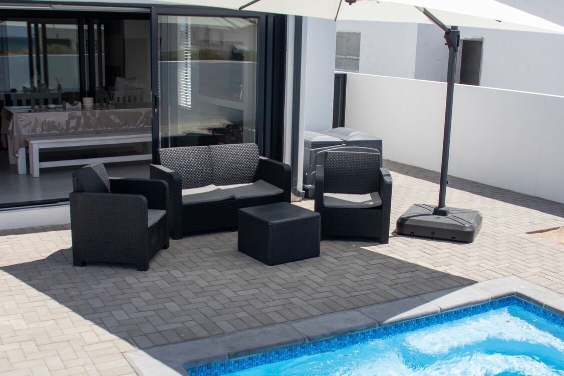 The lounge opens onto an enclosed patio complete with seating and a built-in braai. Outside, guests can enjoy a plunge pool or relax on the outdoor seating. Secure parking is available, and the serene atmosphere of the estate makes this an ideal spot to unwind and experience the beauty of St Helena Bay.